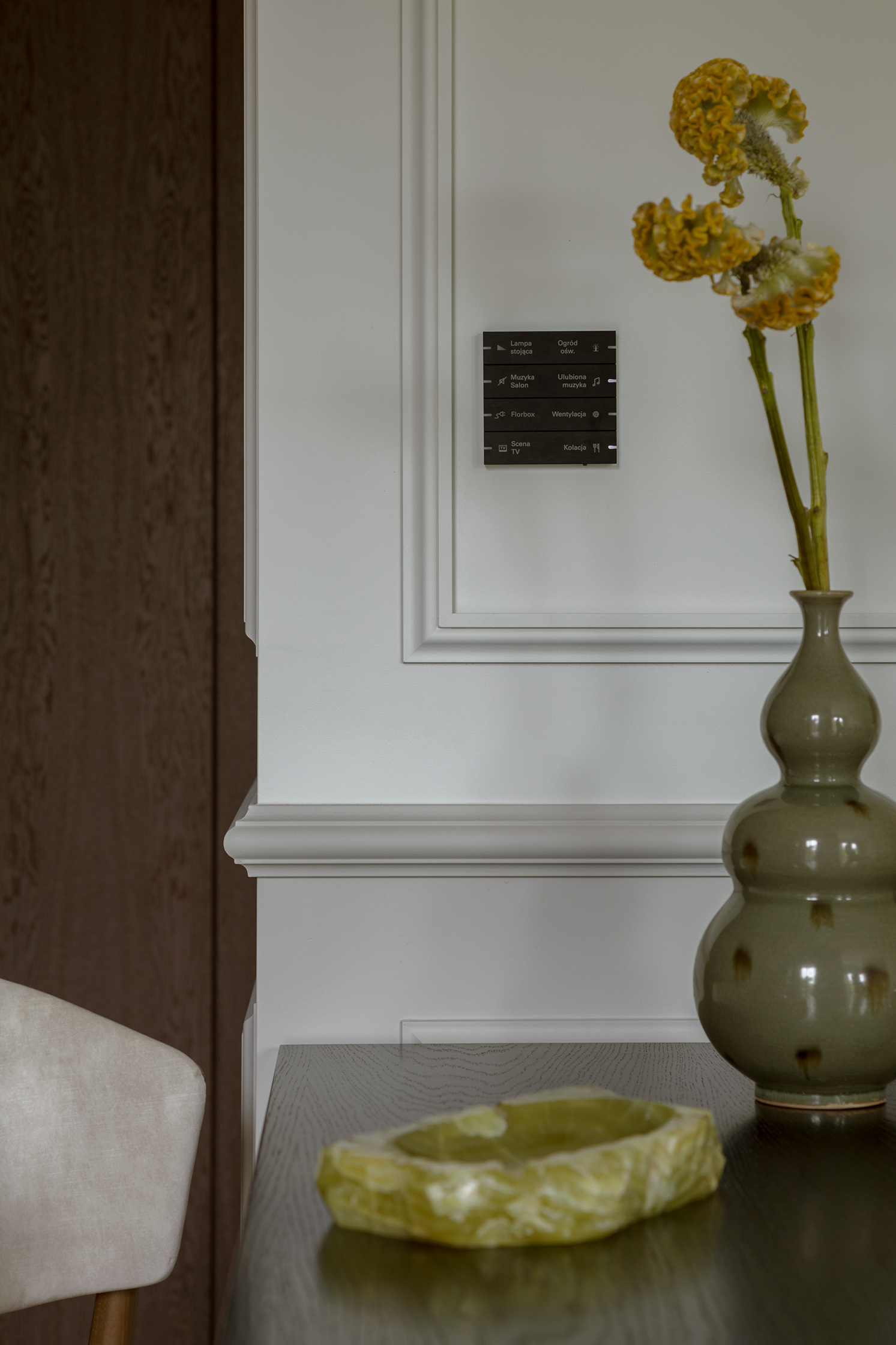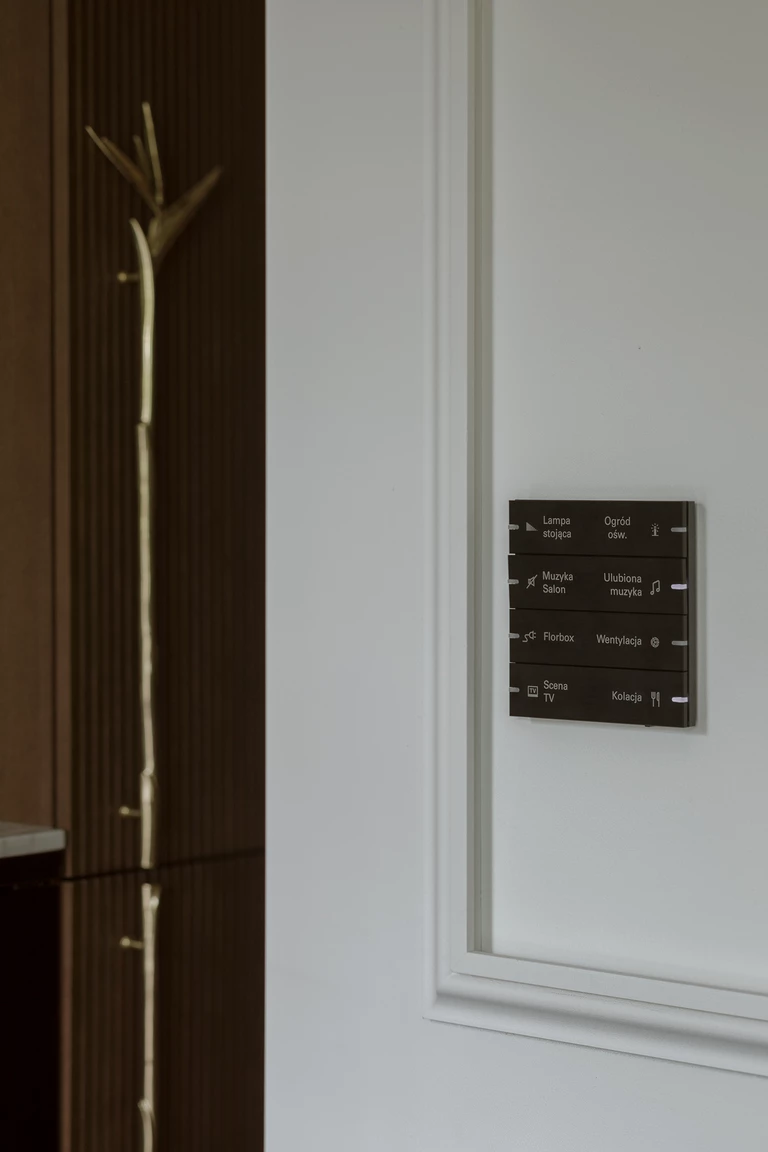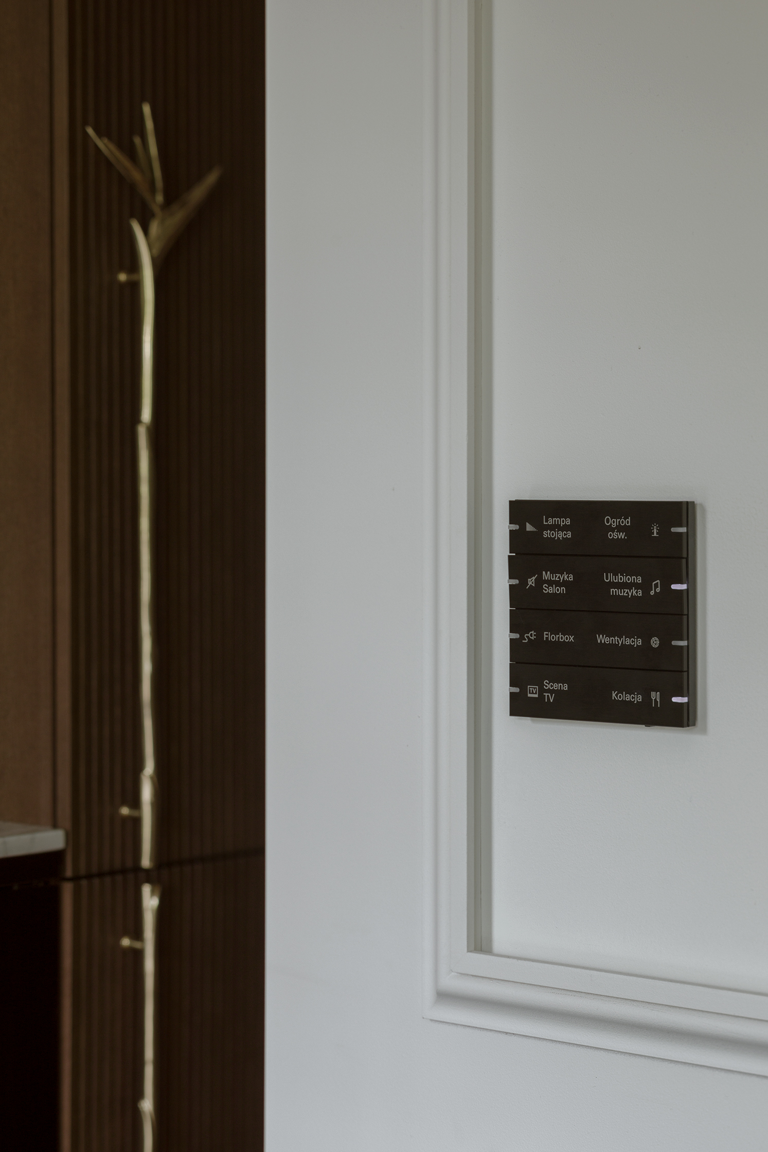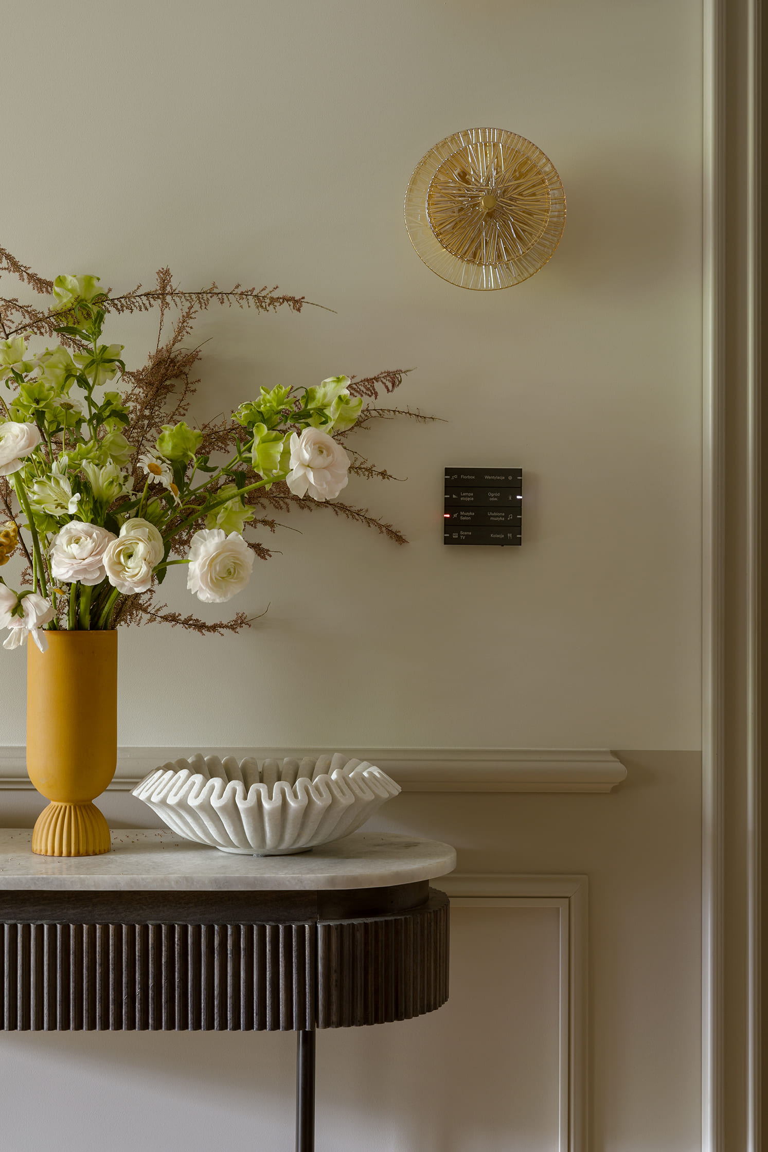 Światło, obok marmuru, jest tu kolejnym pełnoprawnym bohaterem przestrzeni. Raz otula, innym razem podkreśla faktury – gładkość kamienia, miękkość tkanin, rytm sztukaterii. Nawet włączniki Gira stają się elementem dekoracyjnym, dyskretnie połyskując w świetle. System inteligentnego sterowania umożliwia przełączanie mieszkania w tryb poranny lub wieczorny – w zależności od pory dnia, pracy czy nastroju.