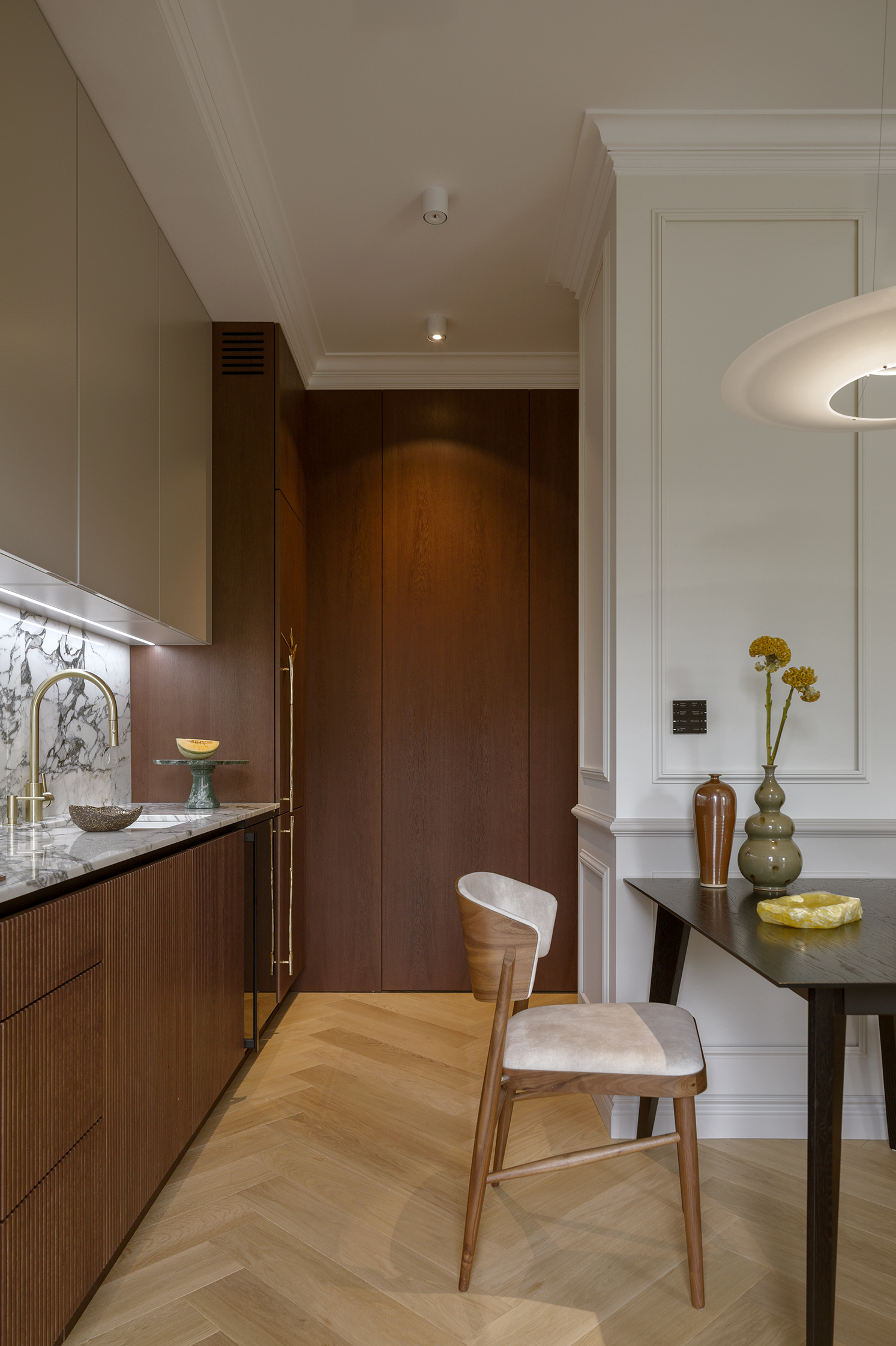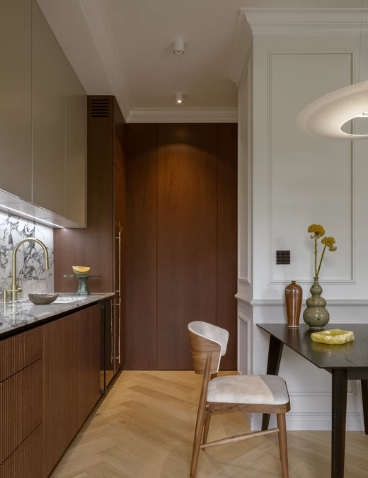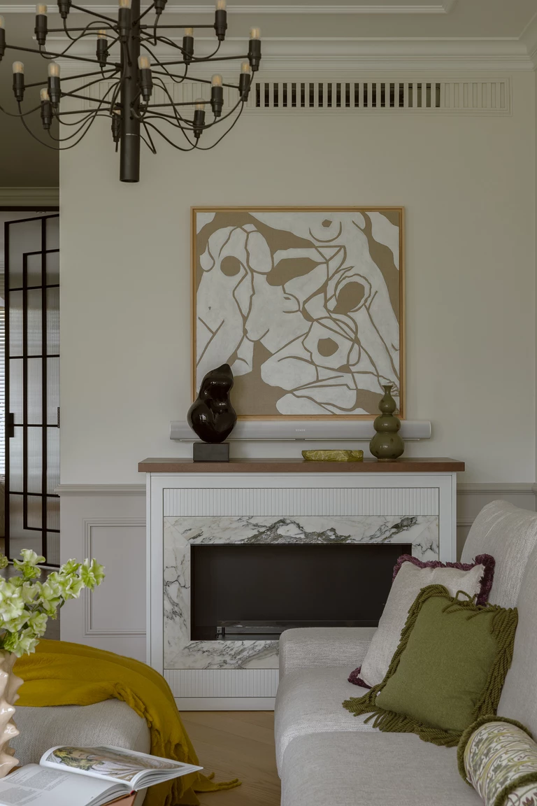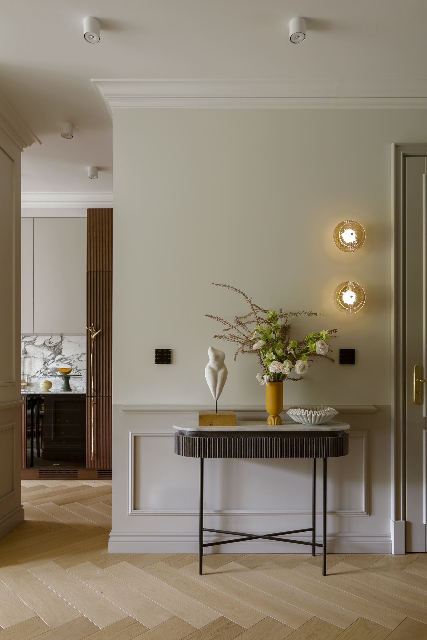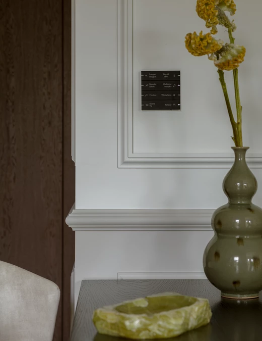 Światło, obok marmuru, jest tu kolejnym pełnoprawnym bohaterem przestrzeni. Raz otula, innym razem podkreśla faktury – gładkość kamienia, miękkość tkanin, rytm sztukaterii. Nawet włączniki Gira stają się elementem dekoracyjnym, dyskretnie połyskując w świetle. System inteligentnego sterowania umożliwia przełączanie mieszkania w tryb poranny lub wieczorny – w zależności od pory dnia, pracy czy nastroju.