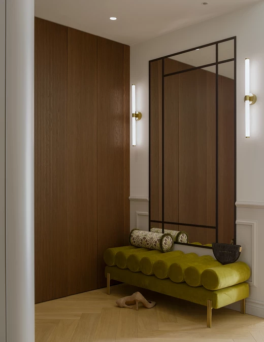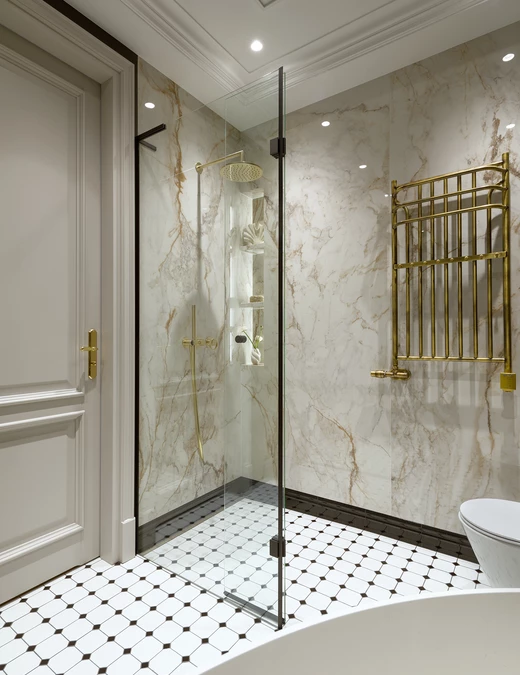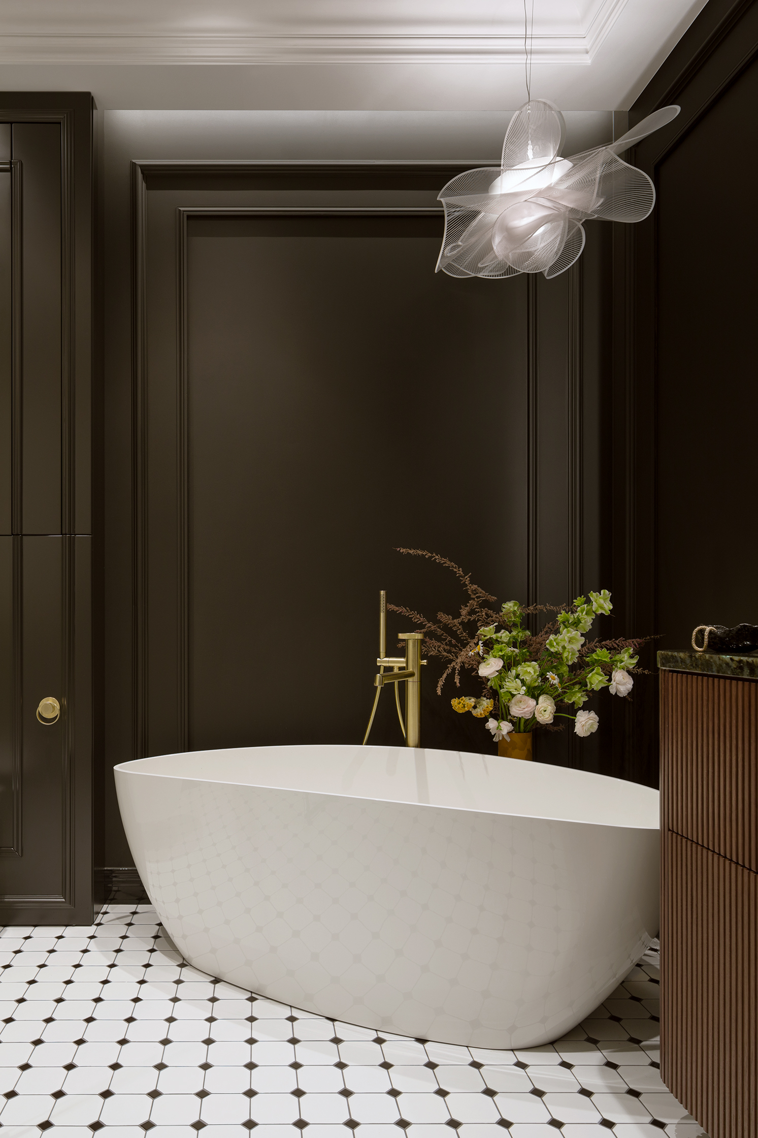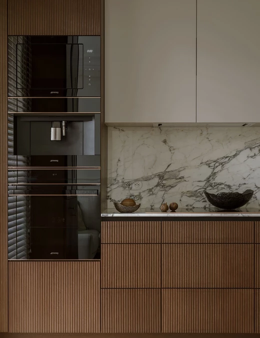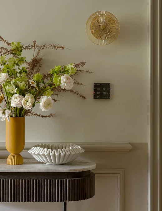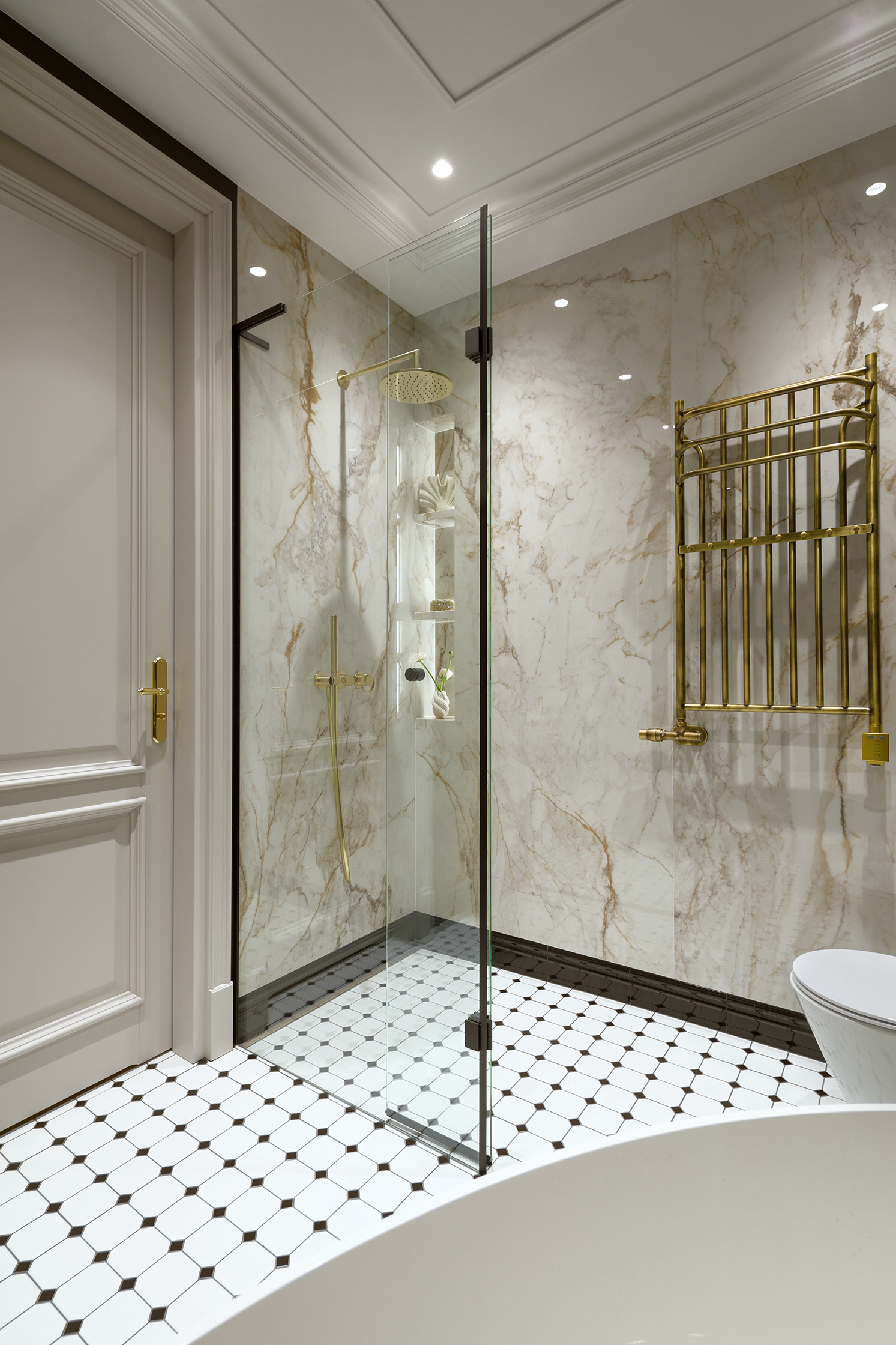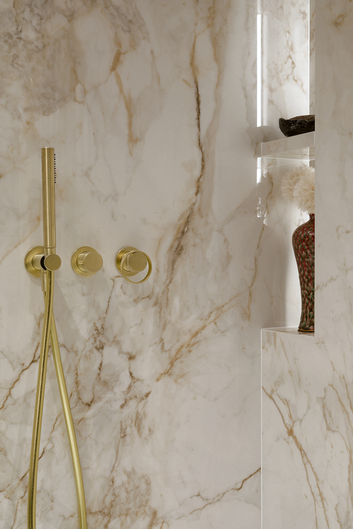 Światło, obok marmuru, jest tu kolejnym pełnoprawnym bohaterem przestrzeni. Raz otula, innym razem podkreśla faktury – gładkość kamienia, miękkość tkanin, rytm sztukaterii. Nawet włączniki Gira stają się elementem dekoracyjnym, dyskretnie połyskując w świetle. System inteligentnego sterowania umożliwia przełączanie mieszkania w tryb poranny lub wieczorny – w zależności od pory dnia, pracy czy nastroju.