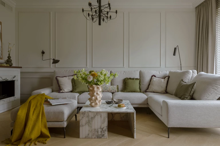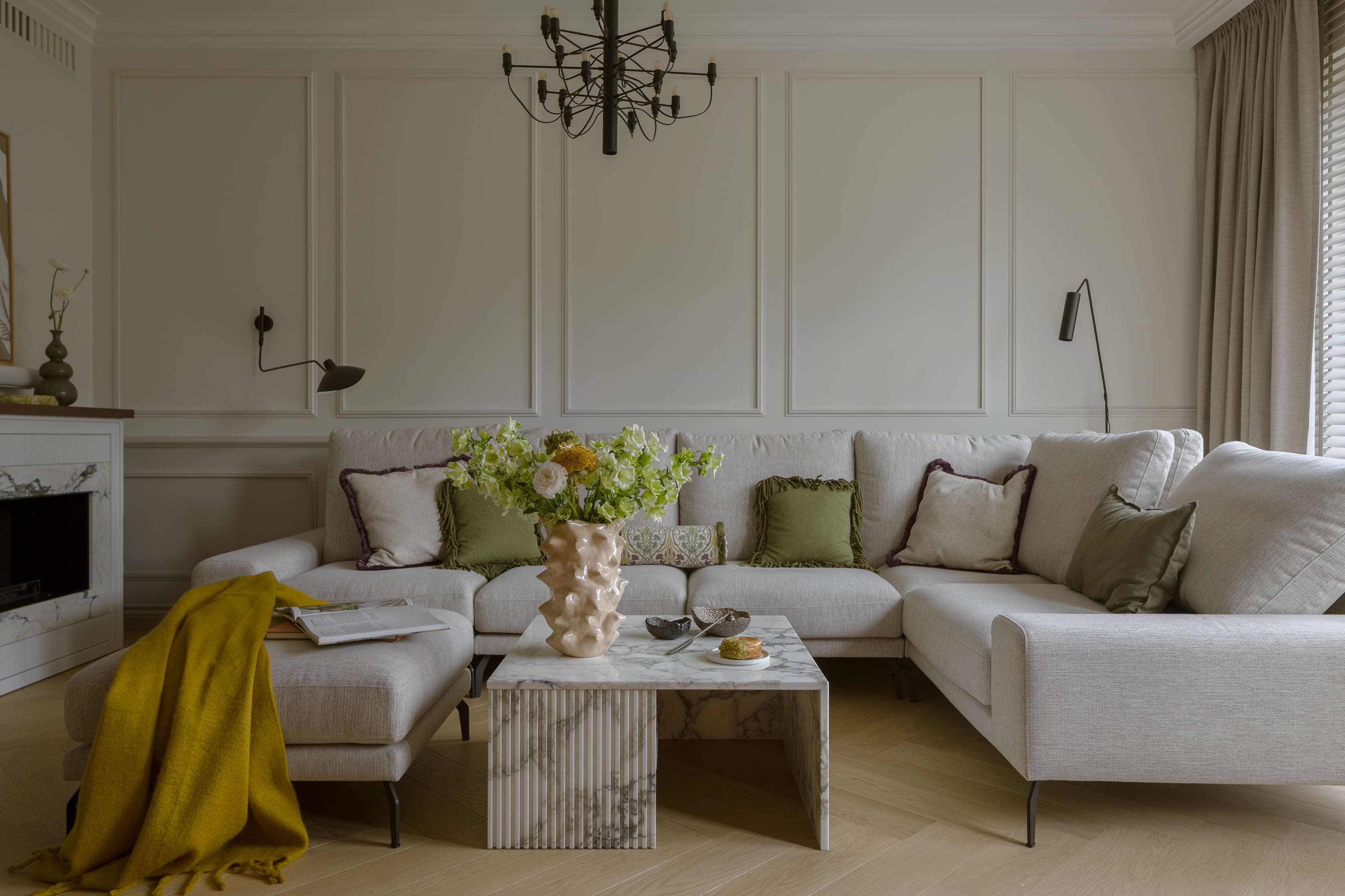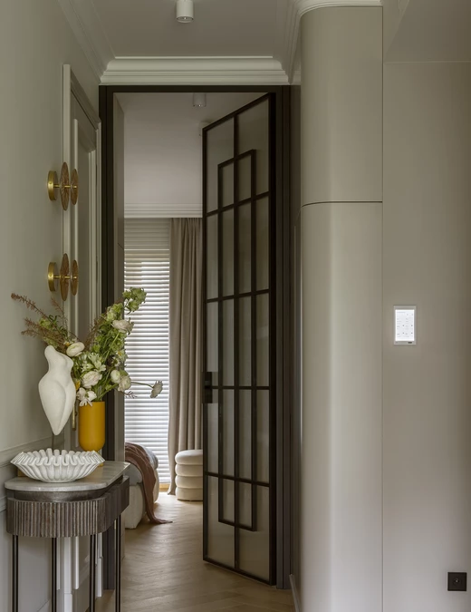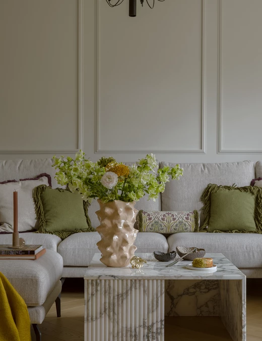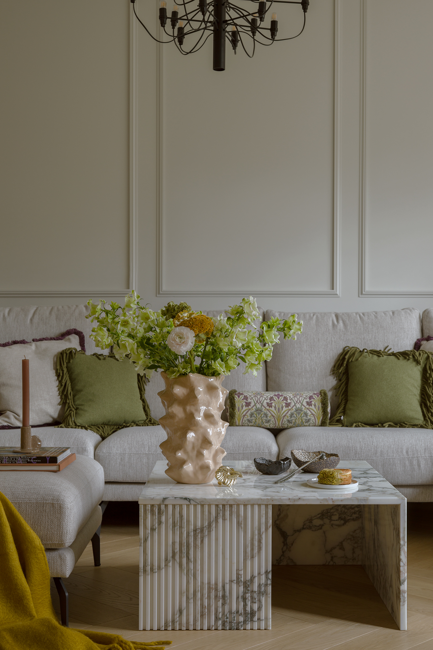Florystyka jawi się tu nie tylko jako profesja, lecz jako sposób postrzegania świata – poprzez fakturę, zapach i gest. Mieszkanie przypomina ogród zimowy: pełne światła, harmonijne w proporcjach i barwach. Dominują beże, ciepłe szarości i naturalne tony, które stapiają się w miękką, spójną całość.