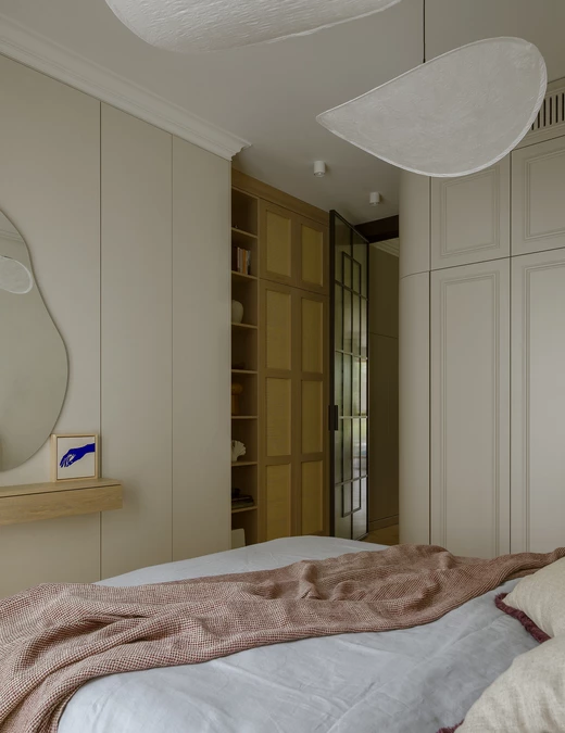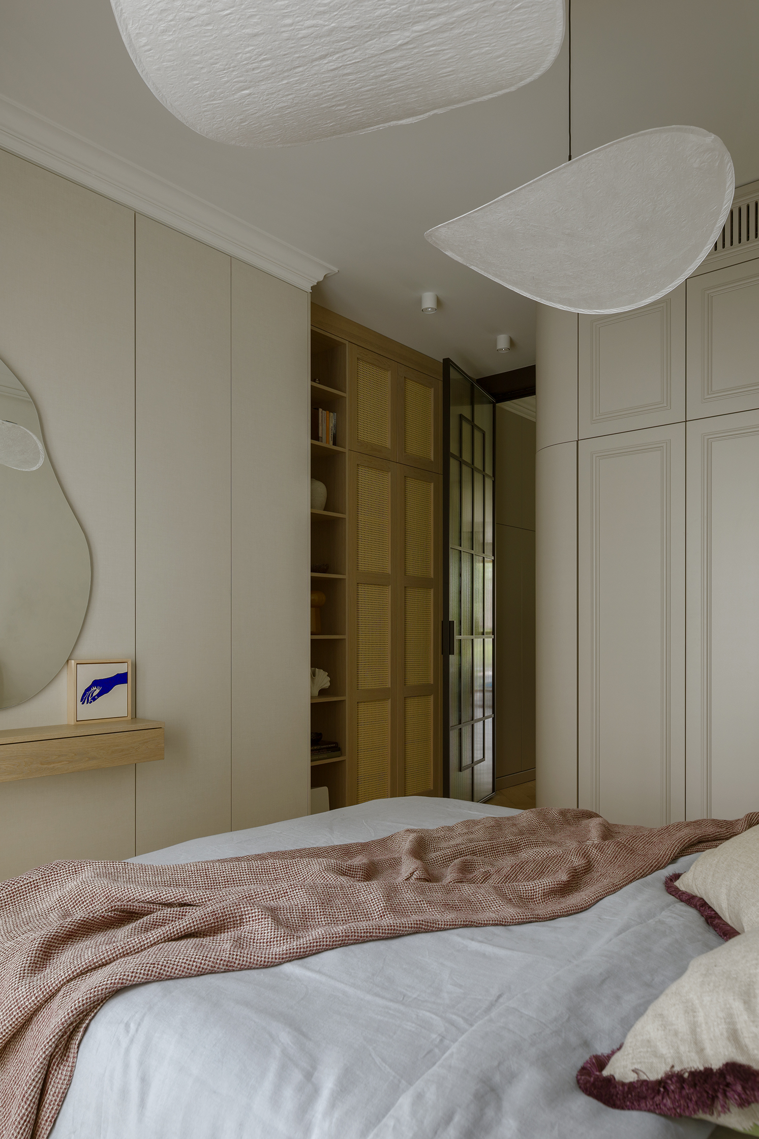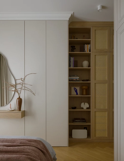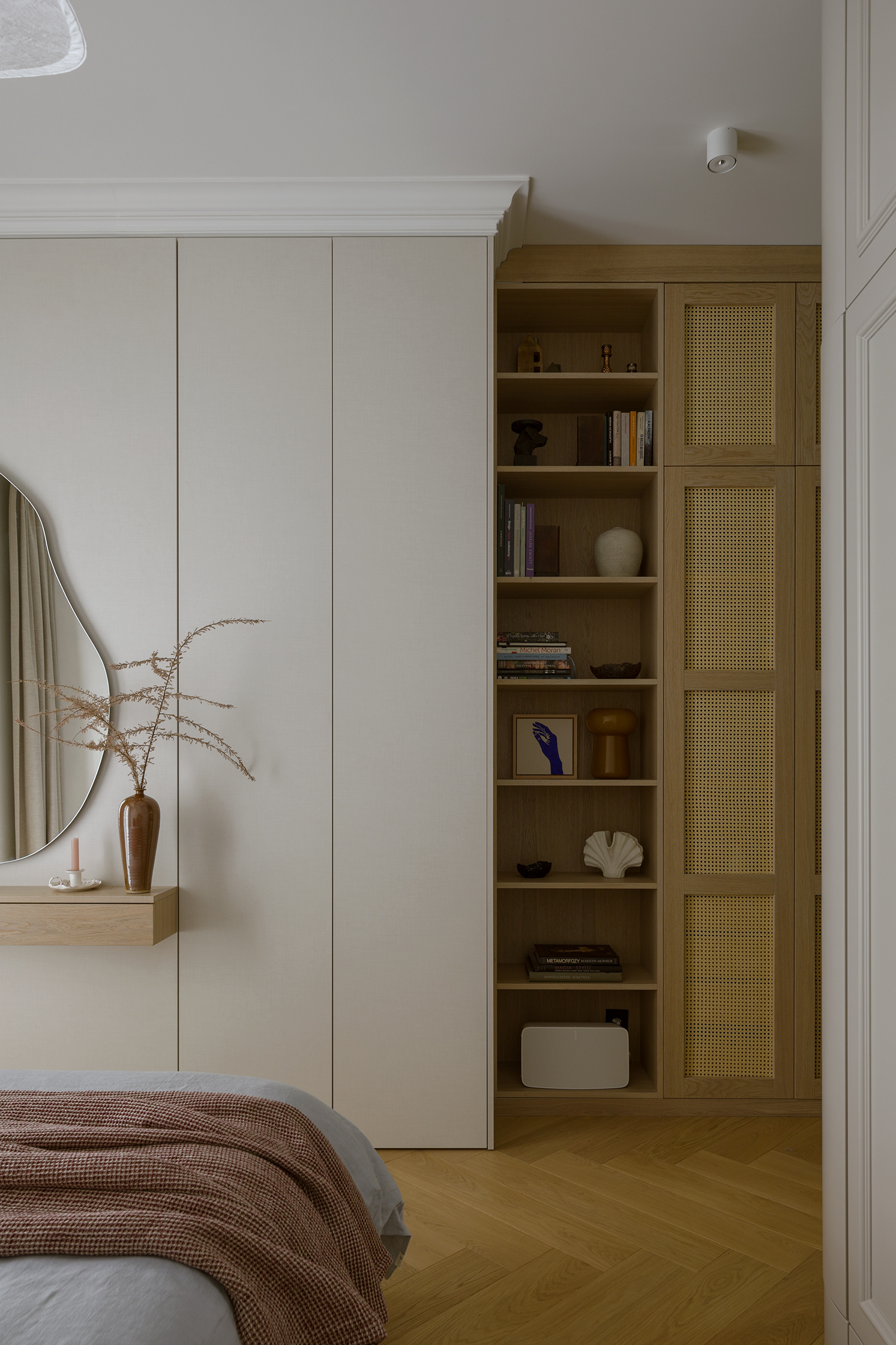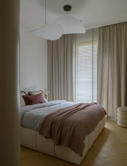 Właśnie ta potrzeba odnalezienia spokoju pośród intensywności stała się punktem wyjścia dla projektu. Wnętrze miało być lekkie, naturalne i kobiece – takie, które uspokaja zamiast przytłaczać, a jednocześnie subtelnie opowiada historię swojej właścicielki.
