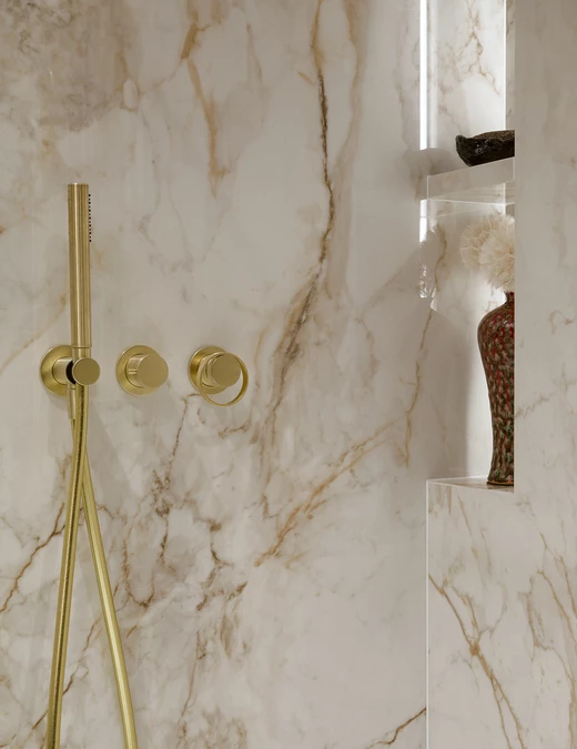 Natomiast wieczorami, kiedy słońce znika już za wzgórzami, wnętrze ożywa na nowo. Delikatne światło rozlewa się po ścianach, odbijając w marmurze i złotych detalach. To efekt precyzyjnie zaprojektowanego systemu oświetlenia Gira KNX, który pozwala sterować natężeniem, barwą światła i roletami jednym dotknięciem.
