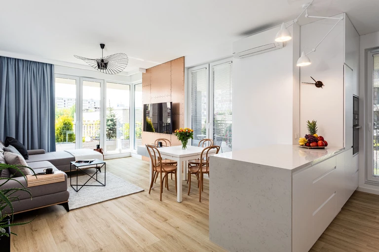 Wspomniane wcześniej kolory dominują w strefie dziennej mieszkania – kuchni, salonie oraz w przedpokoju. Przestronne okna nadają wnętrzu jasności i powiększają je wizualnie. Aby dodać przytulności, podłoga wyłożona została drewnopodobnymi panelami winylowymi, wstawiono tu również gięte krzesła oraz wygodny szary narożnik. Dekoracyjna ścianka za telewizorem została wykonana z laminatu imitującego miedzianą, delikatnie szczotkowaną blachę.