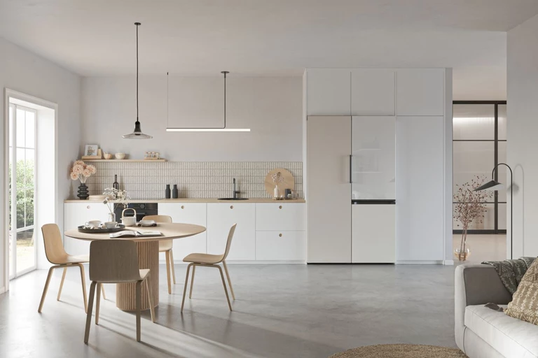 Projekt urzeka nastrojem oraz kolorem. Całość utrzymana jest w stonowanych barwach i uzupełniona wyszukanymi dodatkami. Zaprezentowany projekt w sposób doskonały prezentuje związek lodówki Bespoke ze stylistyką kuchni, wnosząc nową wartość do tej przestrzeni.
