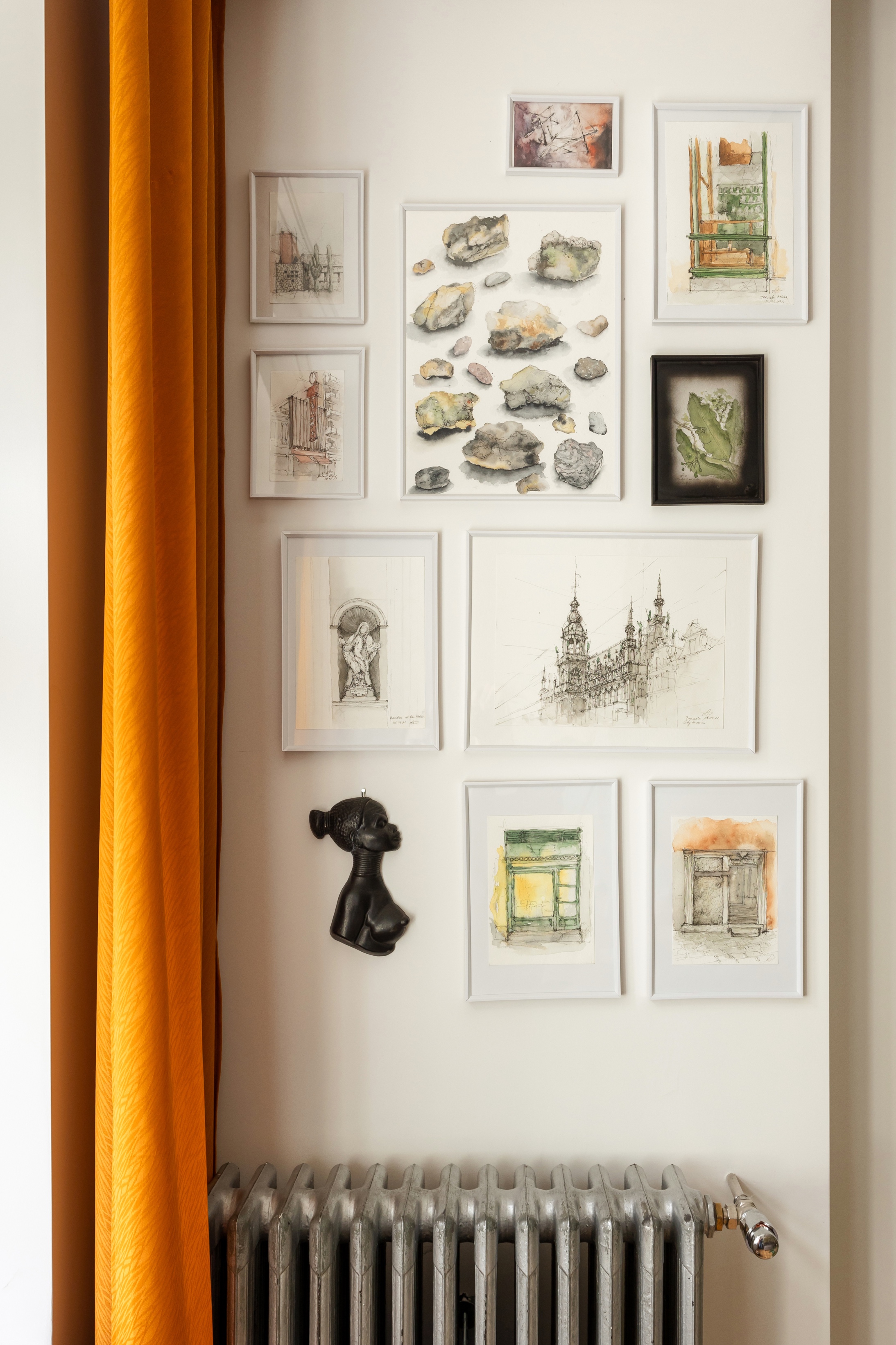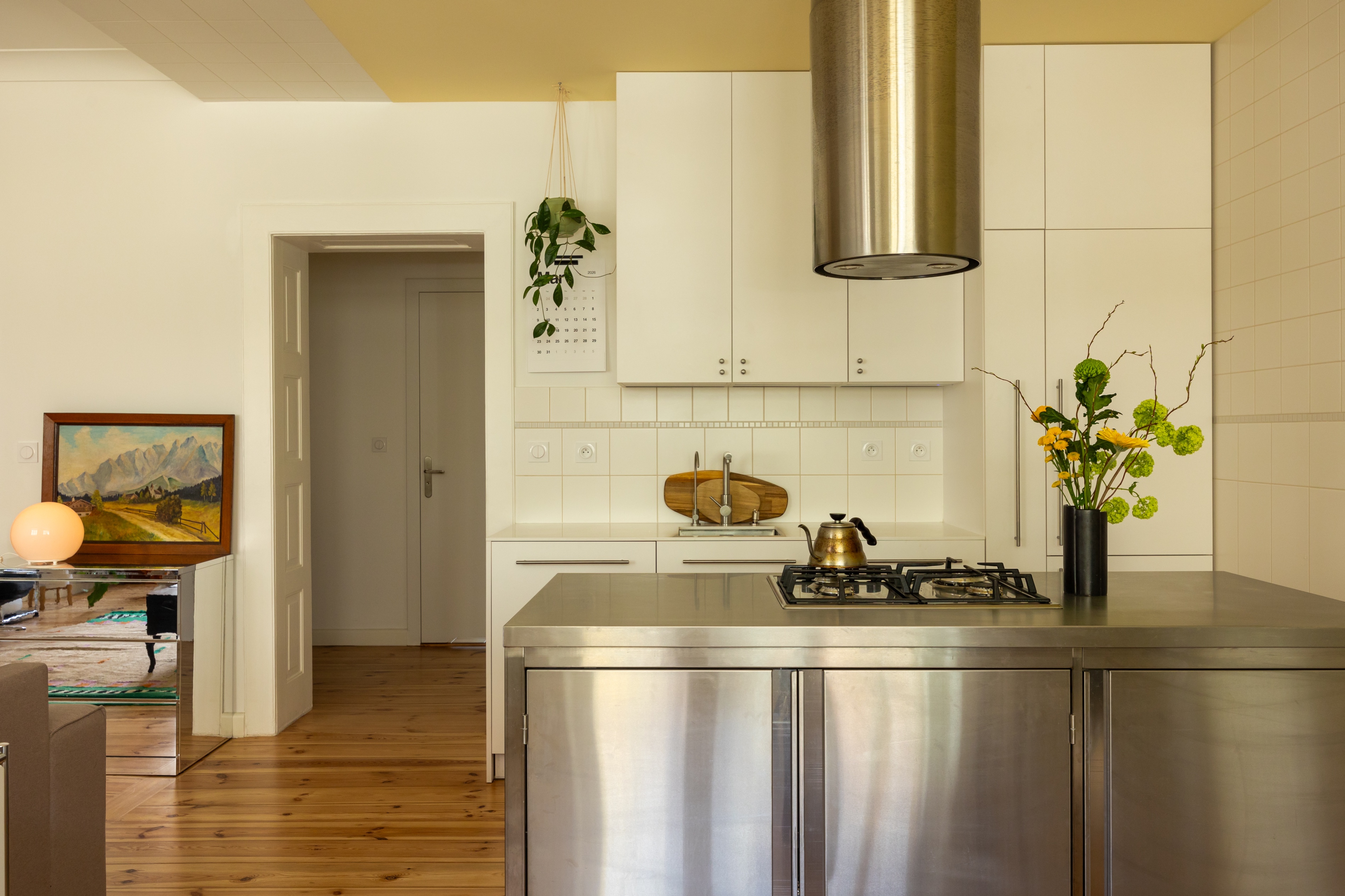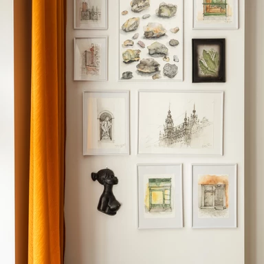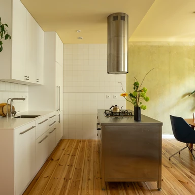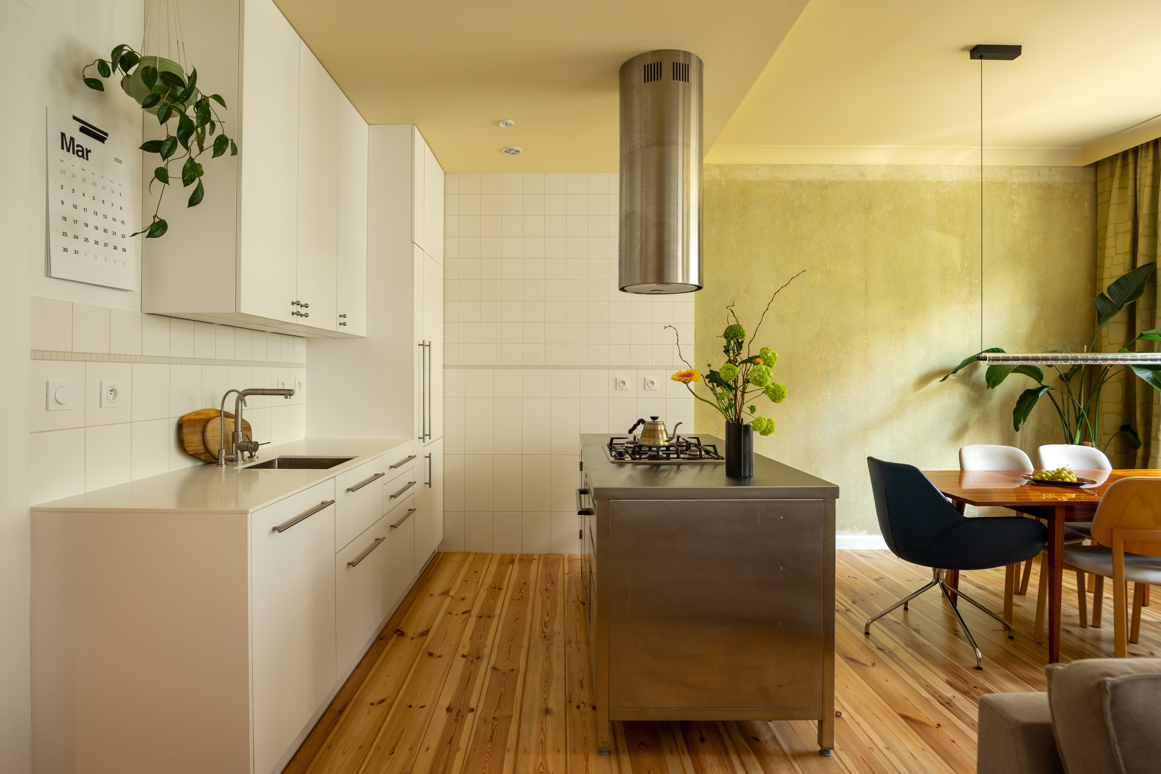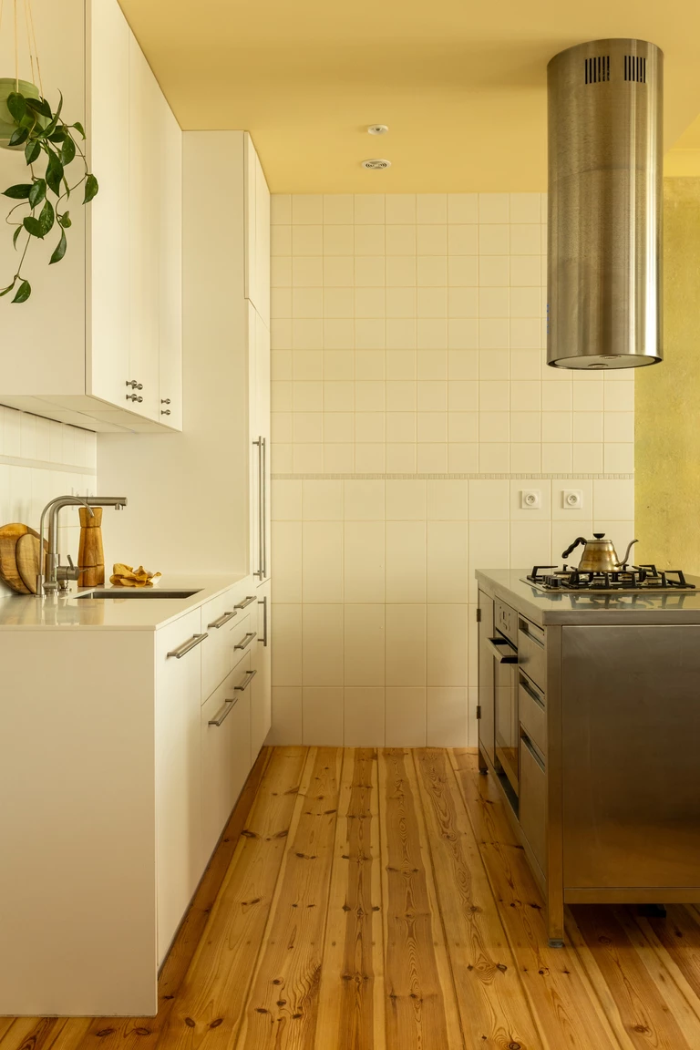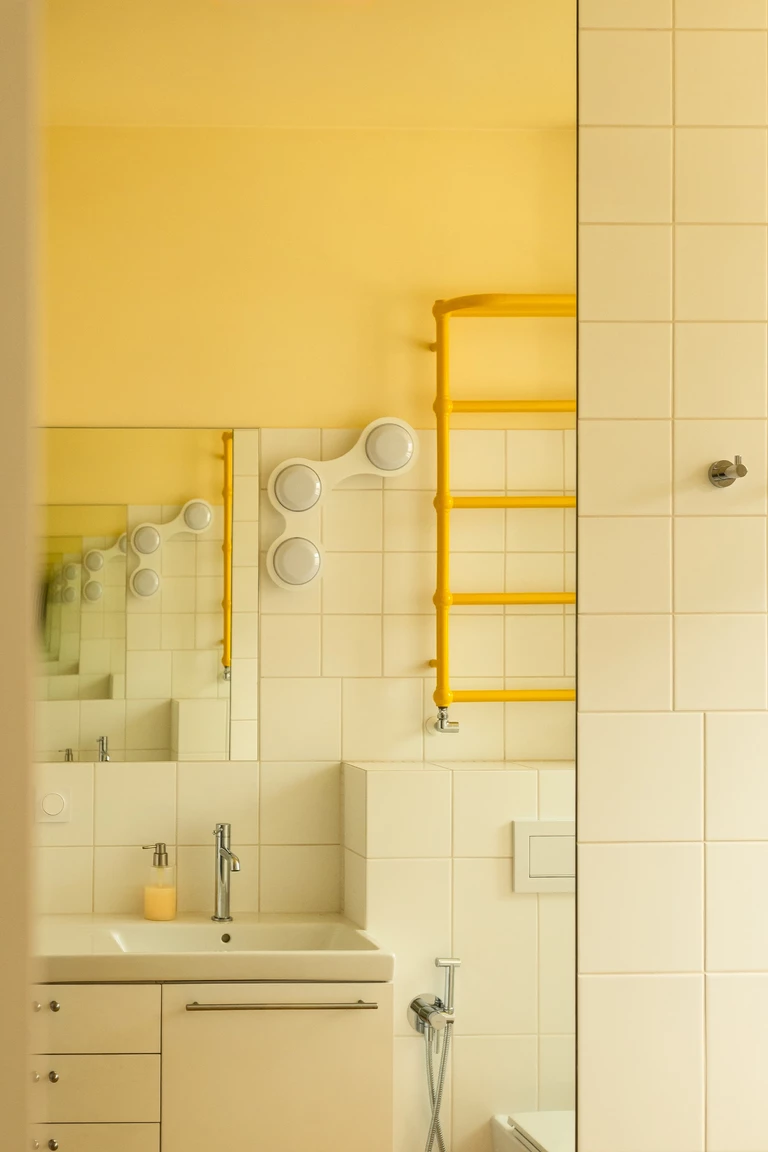 Najbardziej charakterystycznym elementem wizualnym są żółte sufity w kuchni, jadalni, korytarzu i łazience. Wybór tego koloru miał na celu wprowadzenie do wnętrza ciepła i wrażenia światła słonecznego, co jest istotne w mniej słoneczne dni. Paletę materiałową uzupełniają białe, kwadratowe płytki ceramiczne, które nawiązują do historycznego wyposażenia pomieszczeń mokrych z okresu powstania kamienicy.