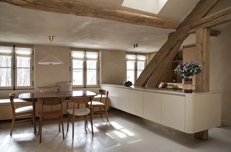 To wnętrze ma w sobie coś z przytulnego domku na wsi – matowe tynki, drewniane belki i mnóstwo naturalnych materiałów. A jednak to centrum Paryża, zaledwie kilka minut od bulwaru Saint-Germain. W dawnych kwaterach służbowych, na ostatnim piętrze kamienicy, projektanci z pracowni Maison A&G stworzyli nostalgiczne mieszkanie dla młodej pary.