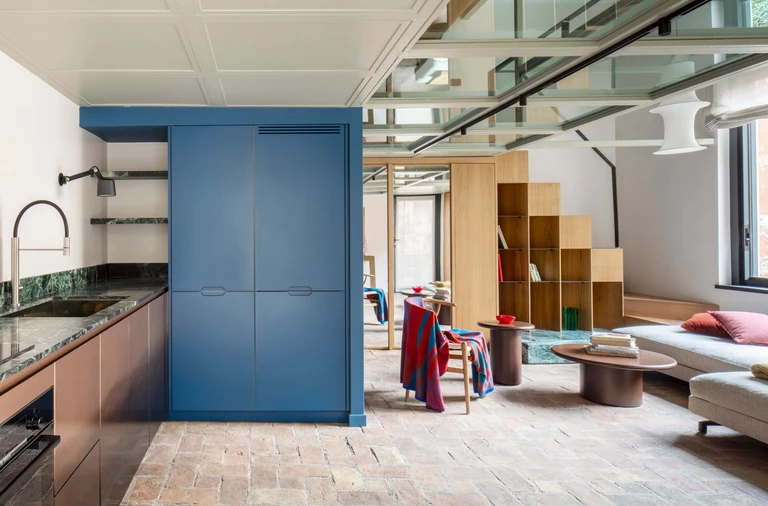 Szklana antresola i niebieski moduł w secesyjnych murach. STUDIOTAMAT w Rzymie