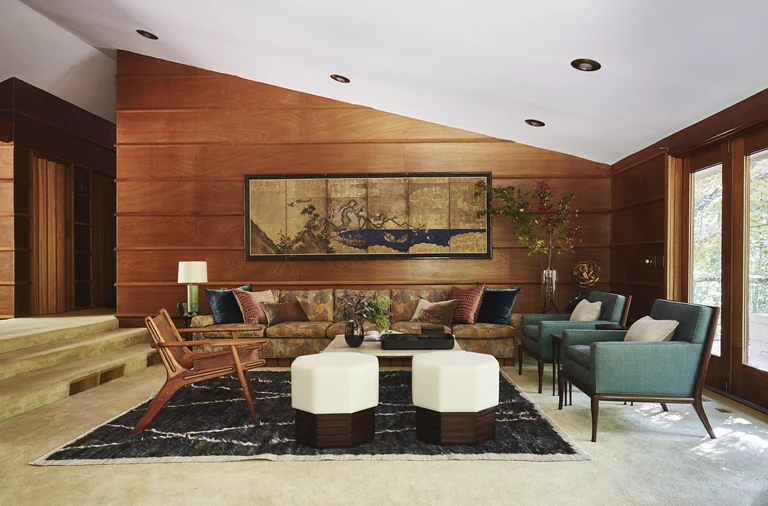 Projektantka Sarah Anderson-Magness trafiła na tę nieruchomość przypadkiem, przeglądając ogłoszenia. W domu projektu Franka Lloyda Wrighta w Blauvelt pod Nowym Jorkiem wciąż mieszkali pierwsi właściciele, a wnętrza były w stanie zbliżonym do tego, który Wright zatwierdził niemal 60 lat wcześniej. Podczas renowacji projektantka postawiła na powściągliwe prace konserwatorskie i zachowanie oryginalnych detali.