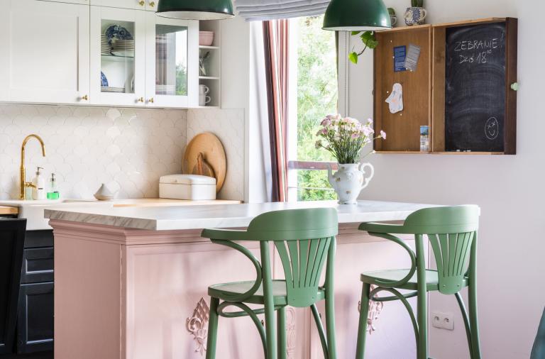 Wiosno, przyjdź już! Chcemy różu, zieleni... Ile można na Ciebie czekać? Póki co, wpraszamy się na herbatkę do kuchni z różową wyspą. Jej właścicielka Kasia Sojka prowadzi jeden z naszych ulubionych blogów wnętrzarskich „Piąty Pokój”.
